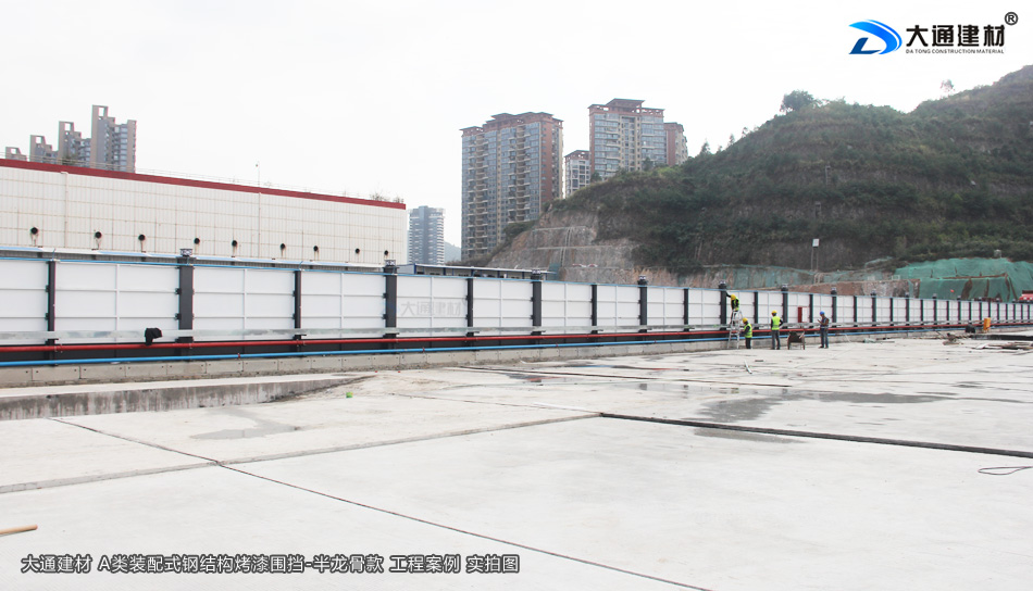 大通建材A類烤漆鋼圍擋-半龍骨款,是一款新型裝配式鋼結(jié)構(gòu)圍擋,圍擋的上下橫梁均為50x50mm深灰色烤漆方通,立柱為300x200mm深灰色烤漆矩形方鋼,2.5米高的每一擋圍擋有8塊(6塊白色、2塊深灰色)烤漆墻板,由左右兩塊墻板與中間暗柱、左右立柱連接組成,安裝得當可以防御10級以上的臺風。了解更多“大通建材A類烤漆鋼圍擋-半龍骨款”的定制生產(chǎn)、配送安裝、價格與規(guī)格等詳情,請直接致電13826562448梁先生 進行溝通