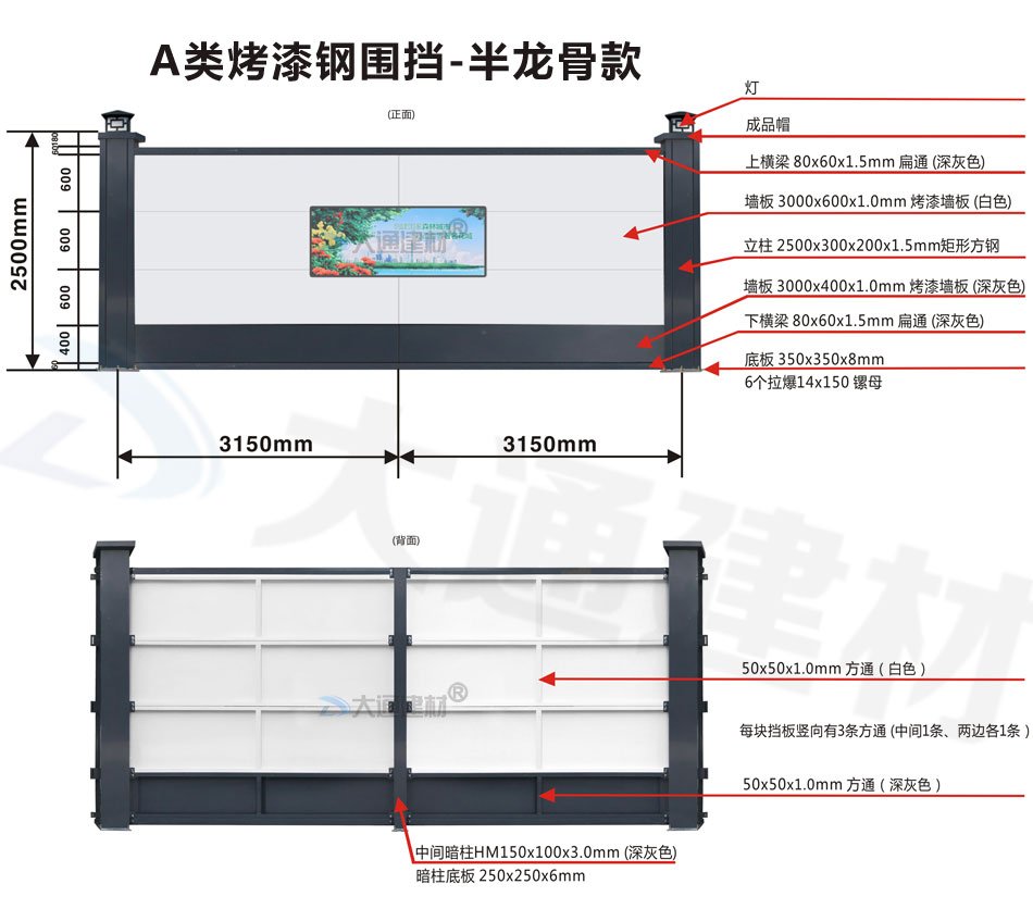 大通建材A類烤漆鋼結構圍擋-半龍骨款,是一款新型裝配式鋼結構圍擋,圍擋的上下橫梁均為50x50mm深灰色烤漆方通,立柱為300x200mm深灰色烤漆矩形方鋼,2.5米高的每一擋圍擋有8塊(6塊白色、2塊深灰色)烤漆墻板,由左右兩塊墻板與中間暗柱、左右立柱連接組成。正常情況下不需要在背部加斜撐也能防御10級左右的臺風。具體規格參數如上圖展示