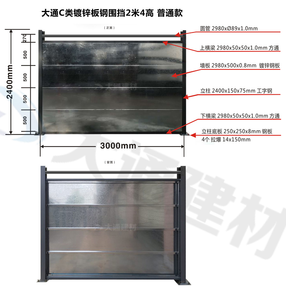 大通圍擋為您解答關于“大通C類鍍鋅板鋼圍擋常用款式的尺寸規格介紹”相關問題?