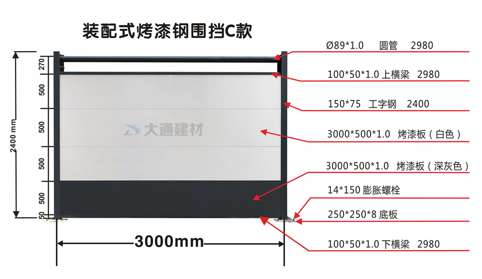 深圳市大通建材有限公司是一家專業的裝配式C類烤漆板鋼結構圍擋生產批發源頭廠家,鋼圍擋品質有保障,安全穩固,廠家直銷 沒有中間商賺差價,批發價格低于同行10%,貨源充足,常規規格下單后即可送貨安裝;特殊要求可以來樣或來圖定制生產,有專業生產團隊,能快速生產出符合您需求的烤漆圍擋,大通建材鋼結構烤漆圍擋,值得你選擇與信賴。咨詢詳情及快速獲取報價 請致電13826562448 加微信號dt13826562448