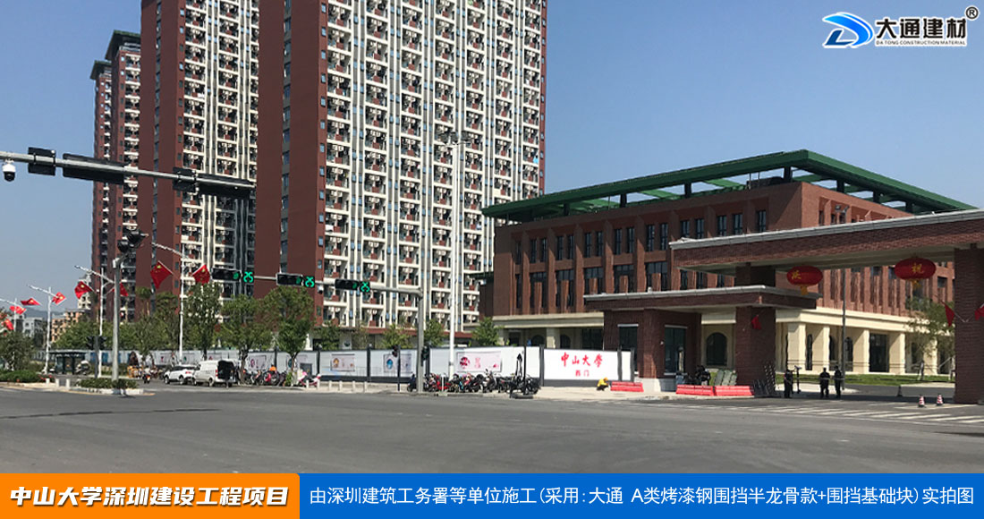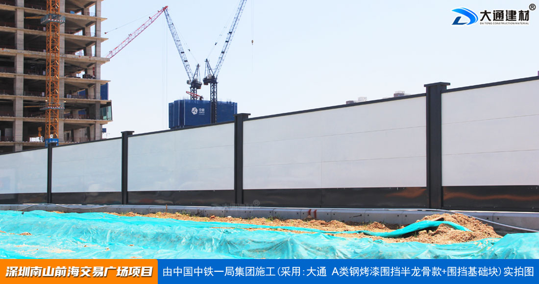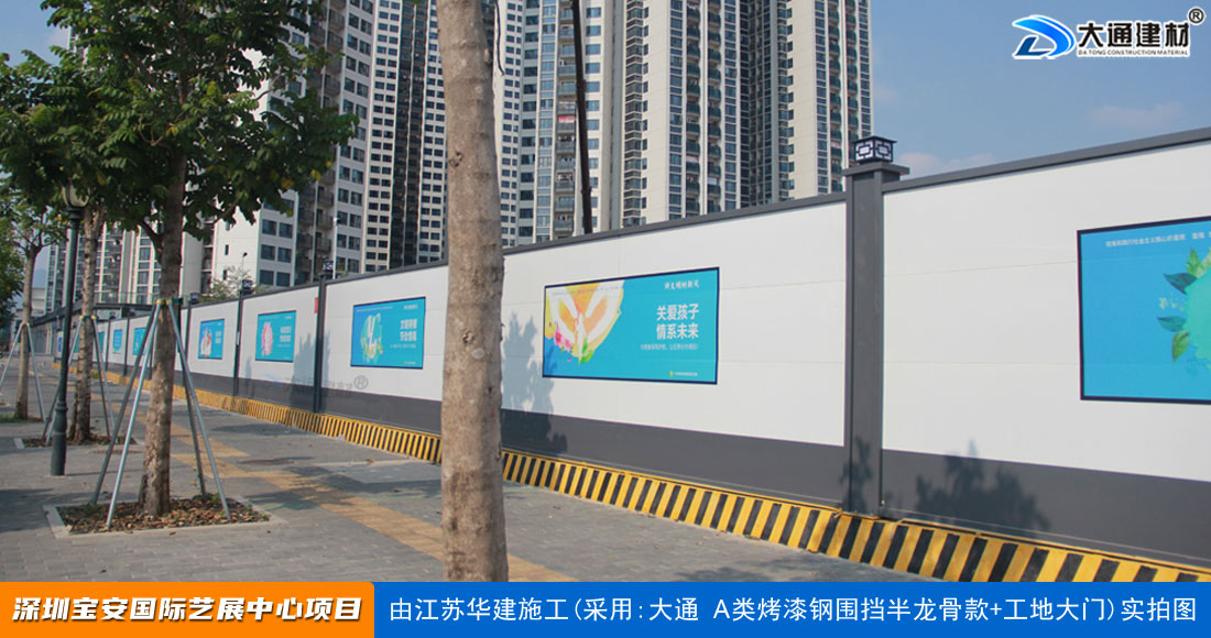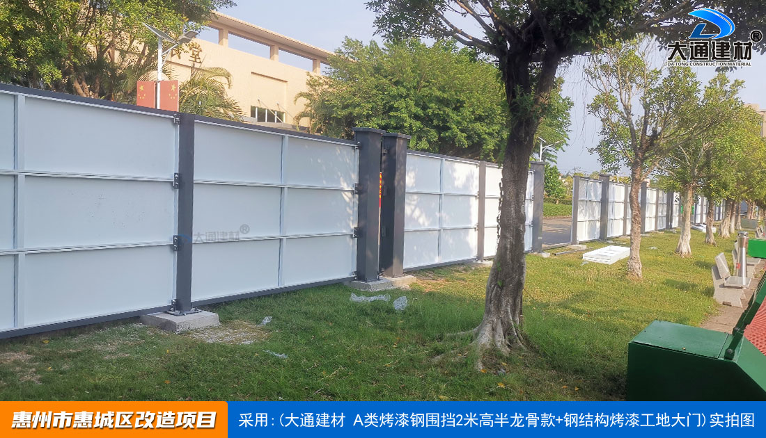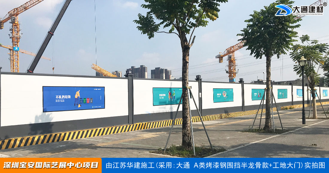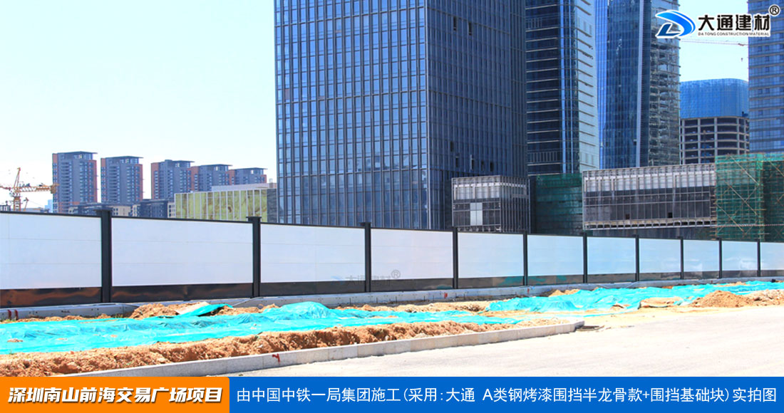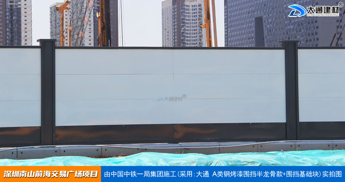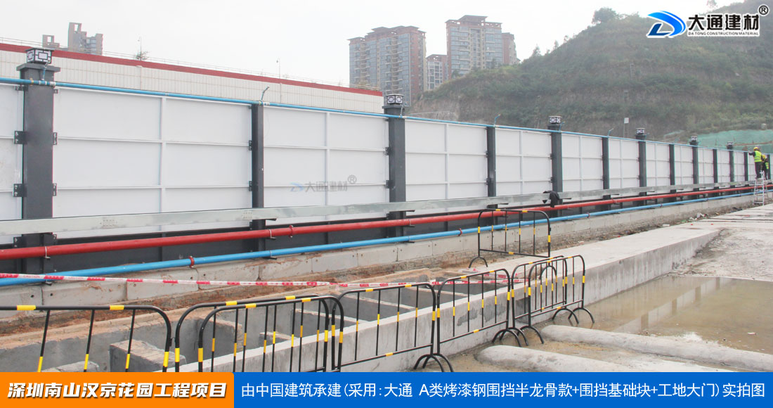 建設工程施工工地四周應按規(guī)定設置連續(xù)、密閉的鋼結構施工圍擋,建造多層、高層建筑的還應設置安全防護設施。在市區(qū)主要路段和市容景觀道路及市場、機場、碼頭、車站廣場等人流量、車流量比較多的地方設置的施工圍擋的高度不得低于2.5m,在其它路段設置的圍擋的高度不得低于1.8m。而深圳市大通建材A類鋼圍擋烤漆半/無龍骨款的標準高度是2.5米、長度為6.3米一擋,而圍擋高度特殊需求的如3/米/4/米/5米/6/米等高度的可以進行定制化生產。
