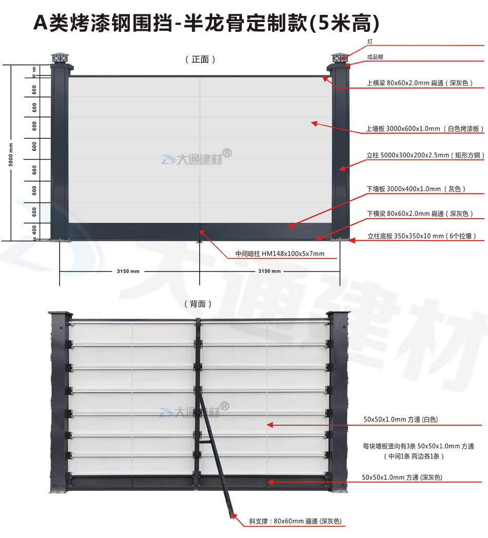 深圳大通建材生產(chǎn)的A類烤漆鋼圍擋半龍骨5米高定制款適用于各種市政工程建設(shè)施工、房地產(chǎn)項目建設(shè)施工、地鐵修建項目施工、管網(wǎng)改造、小區(qū)改造、城市建設(shè)、道路修建施工等工程使用